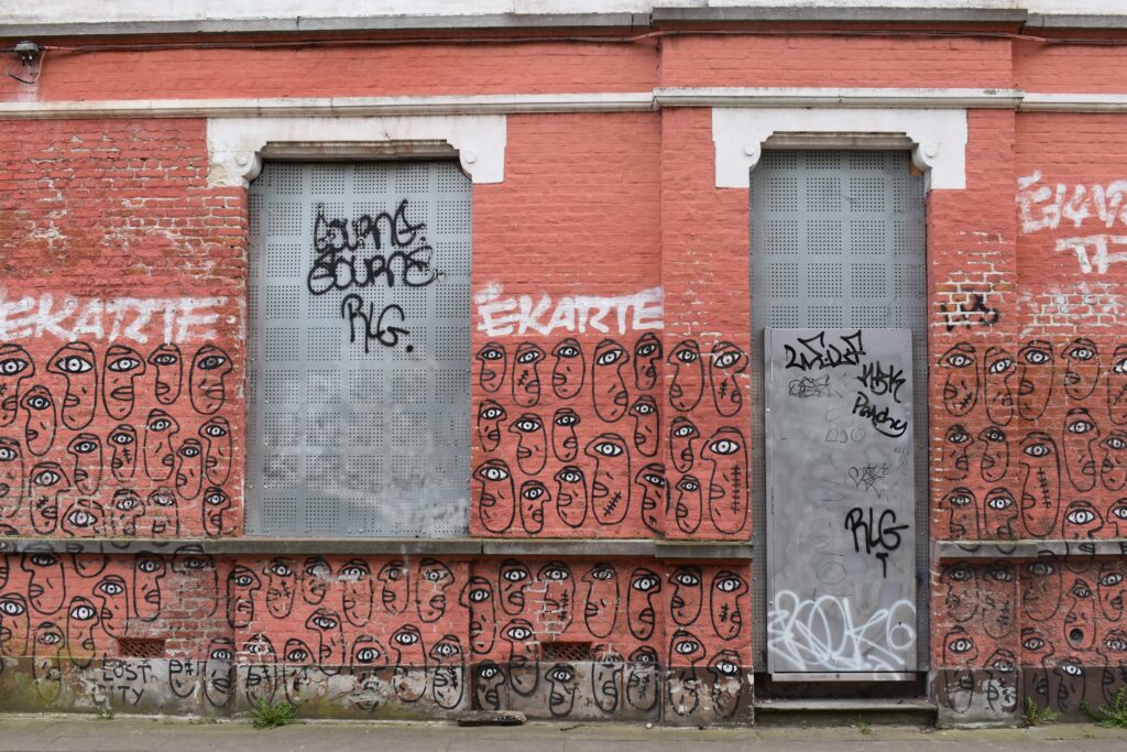 Doel est ce qui se rapproche le plus d’un musée d’art urbain à ciel ouvert. Depuis Bruxelles, la route y menant nous fait passer par le port d’Anvers. Nous nous arrêtons sur un terrain vague, à côté de ce qui semble être un hangar. Ce dernier borde la Engelsesteenweg, au bout de laquelle se trouve le centre du bourg. La plupart des maisons alentours sont à l’abandon sauf une qui semble être encore habitée. Ainsi débute l’exposition. Chaque bâtiment se présente sous ses atours particuliers. Certains recouverts de tags sauvages, d’autres de lierres et de ronces. D’autres encore peuvent s’enorgueillir d’être parées de réelles œuvres de street-art.